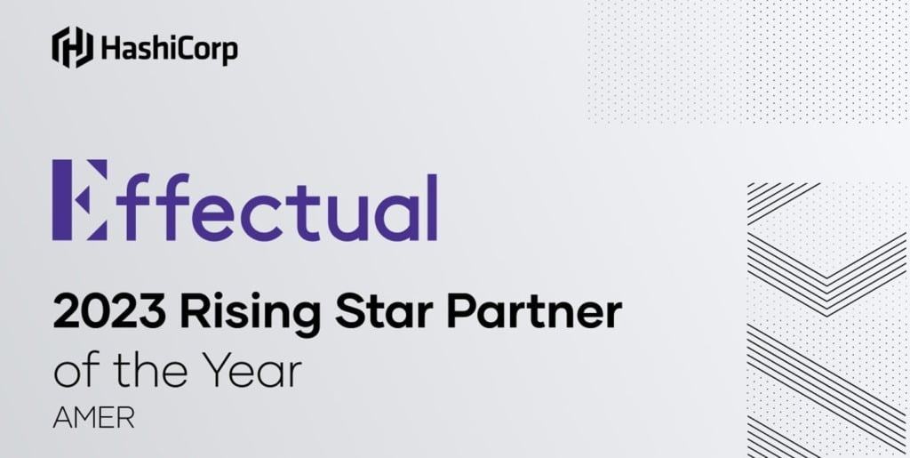 Jersey City, NJ – October 12, 2023 – Effectual, a modern, cloud-first managed and professional services company, has been named the 2023 HashiCorp Rising Star Partner of the Year. Effectual was recognized for ongoing efforts to continually expand its HashiCorp expertise and deliver innovative solutions that help enterprises adopt modern automation and security using the power of HashiCorp’s products. Effectual is a Hyper-Specialized member of the HashiCorp Partner Technical Competency Program for Systems Integrators. This award follows Effectual earning the HashiCorp Infrastructure Competency and the HashiCorp Security Competency over the past year.