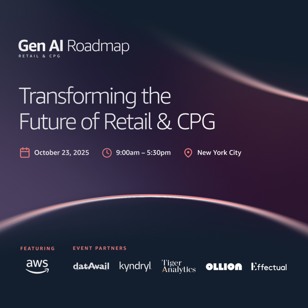 Join Datavail, Kyndryl, Tiger Analytics, Ollion, and Effectual for an AWS-focused day of insights and innovation exploring how Generative AI is transforming the future of retail and CPG.